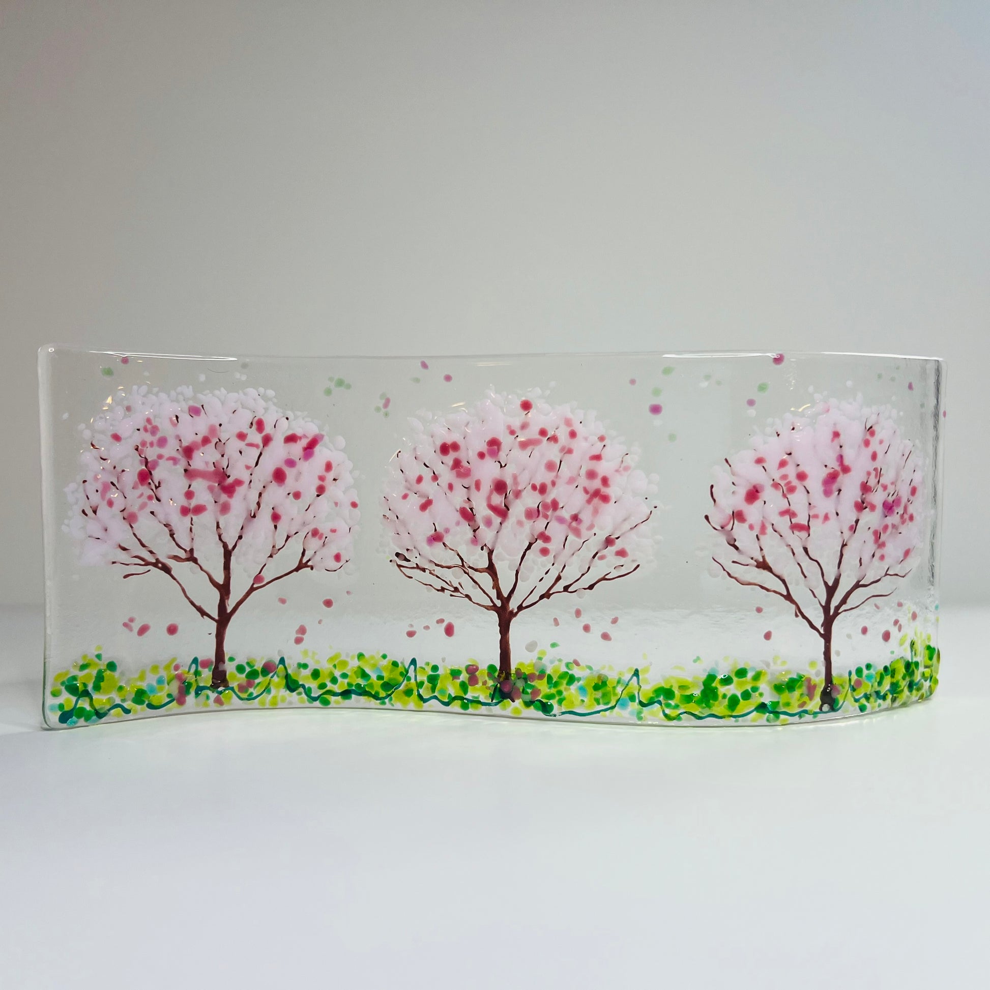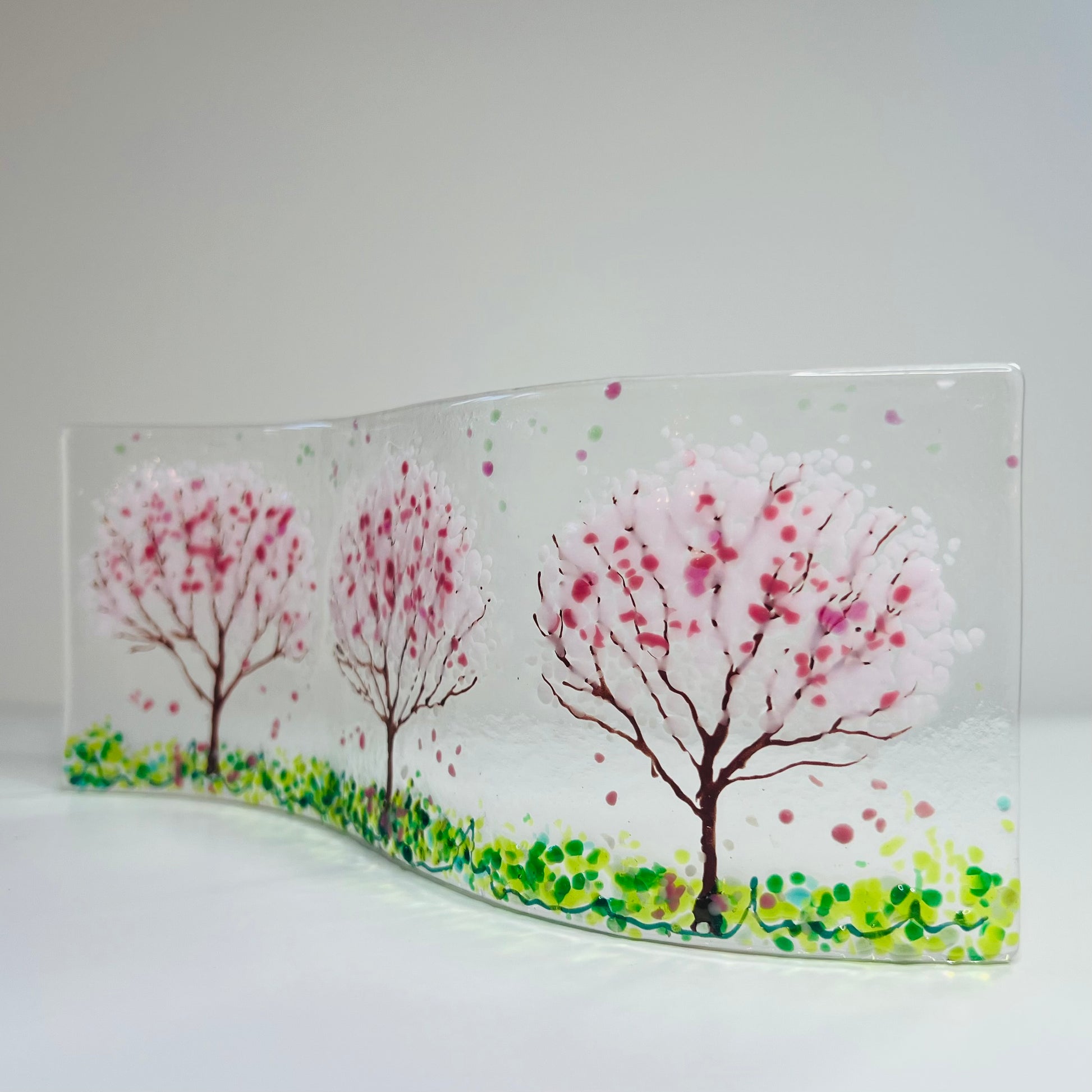A handmade fused glass wave with a beautifully textured surface. Add colourful charm to your home with this unique trio of cherry blossom trees. It features pretty Cherry blossom trees in full bloom. The textured glass creates a beautiful 3D effect. Designed to stand on its own, this unique artwork catches the light, bringing the cherry blossom trees to life .