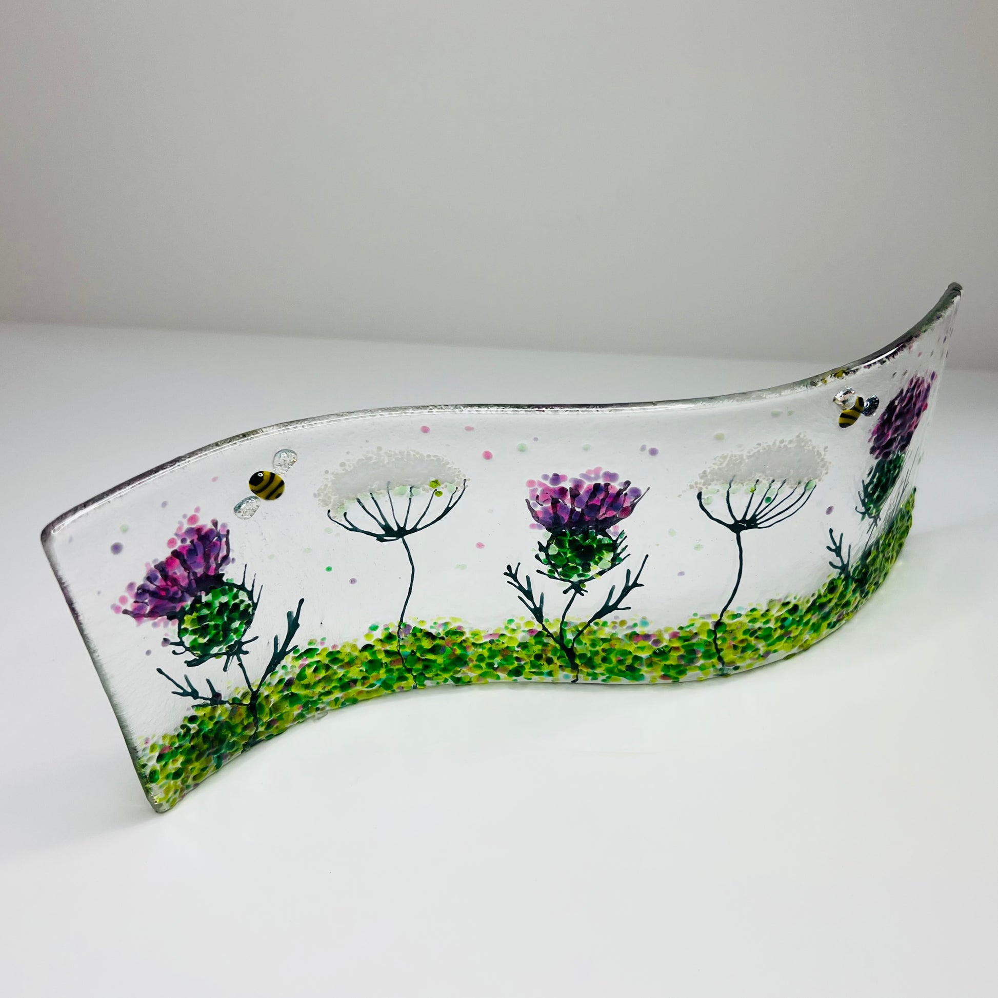 A handmade fused glass wave with a beautifully textured surface, featuring vibrant thistles, delicate cow parsley, and bees with sparkling wings. Designed to stand on its own, this unique artwork catches the light, bringing the intricate wildflower scene to life.