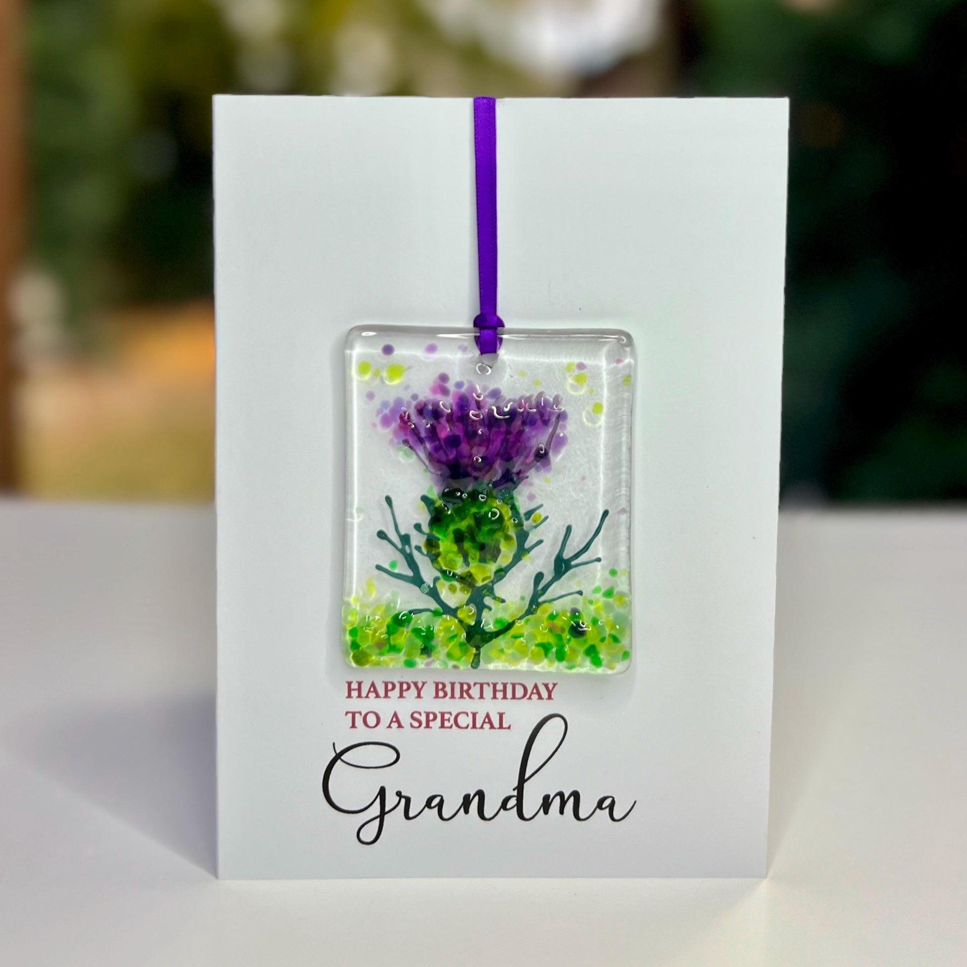 This A6 card features a “Happy Birthday to a Special Grandma” message and includes a floral fused glass keepsake that doubles as a detachable suncatcher. With various colour options, you're giving both a card and a unique gift to hang.