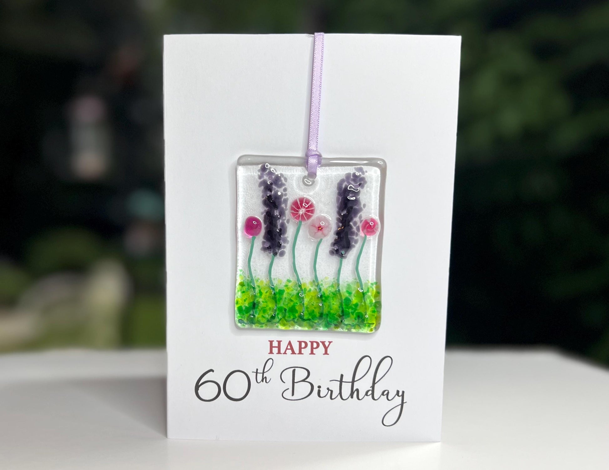 This A6 card has a “Happy 60th Birthday” message on the front, and also comes with a lovely floral fused glass detachable keepsake/ suncatcher. There are 5 different colour options to choose from.