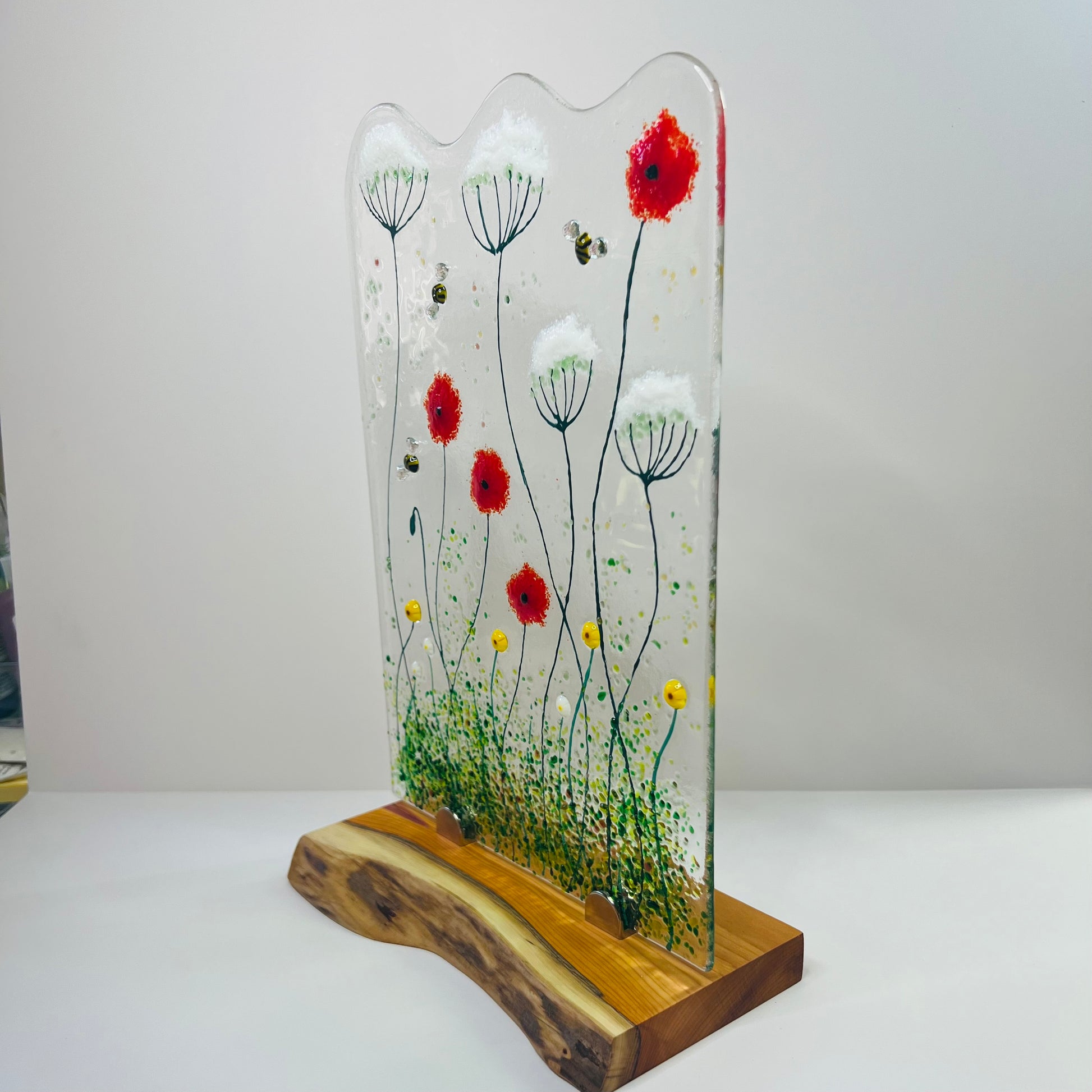 This large handcrafted fused glass panel on a yew wooden stand features a hand cut curved top glass panel with a unique hand-painted poppyand cow parsley design, and includes two little glass bees with sparking glass wings. Created with handpainted enamel detailing and vibrant glass fragments which create a sparkling 3D effect.